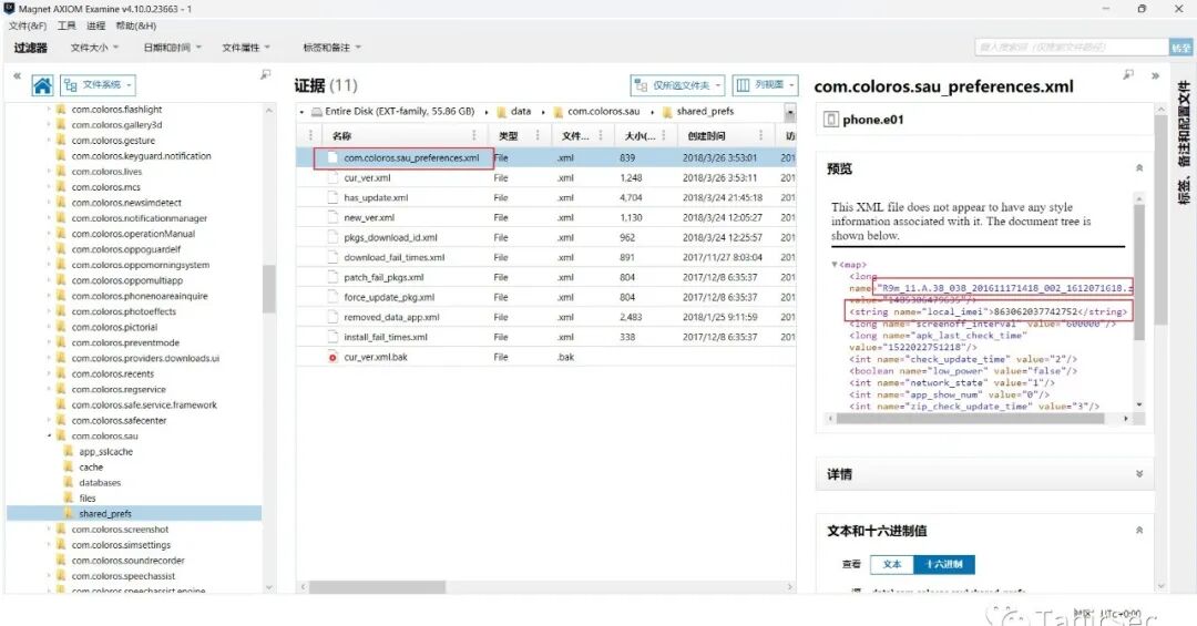 查看/data/com.coloros.sau/shared_prefs/com.coloros.sau_preferences.xml文件获得系统版本号,同时获得IMEI号863062037742752。