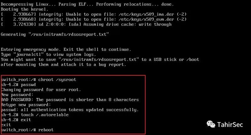 进入紧急模式,chroot /sysroot切换到sh,修改root密码,touch /.autorelable保存设置,退出后正常重启系统。
