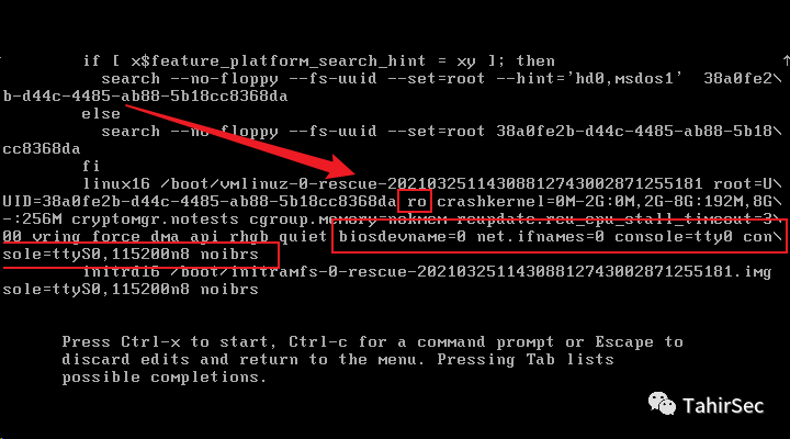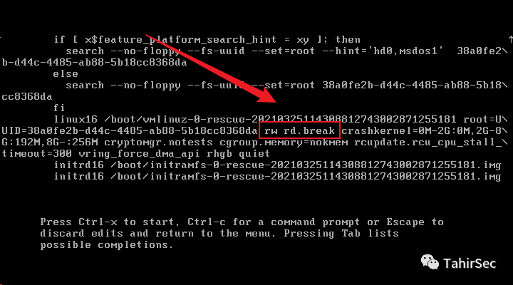 修改ro为 rw rd.break,按ctrl+x启动系统。