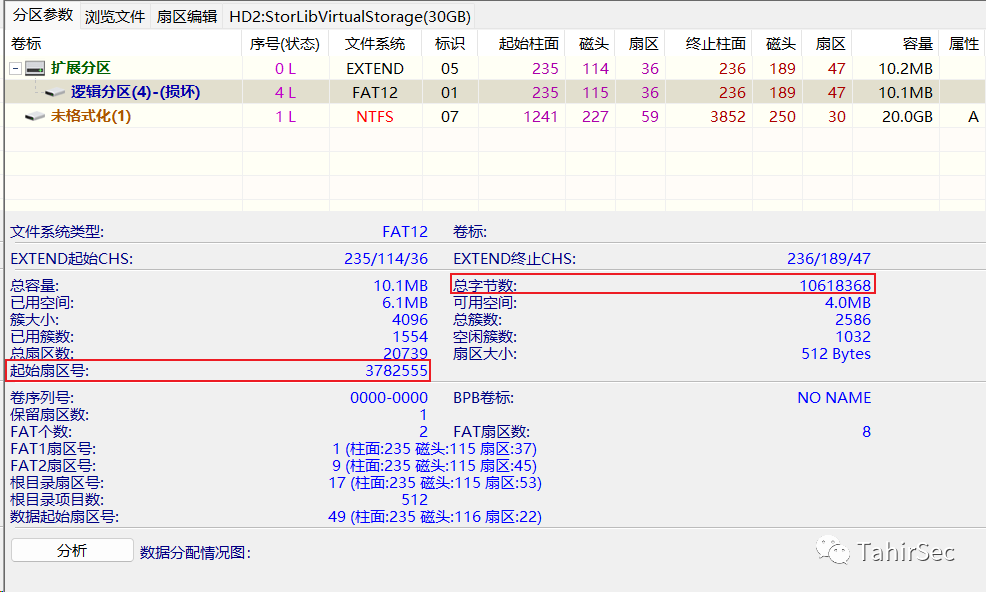 监控硬盘是被格式化后的,则没有标记未格式化的逻辑分区(4)就为监控硬盘,查看逻辑分区(4)的起始扇区号和字节数。