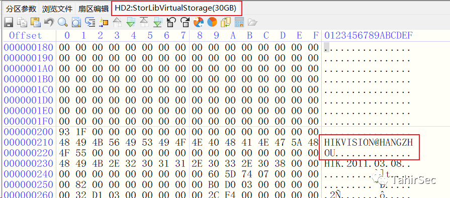 使用DiskGenius查看一下检材 4.e01十六进制数据,偏移不远处就看到海康威视字符串。