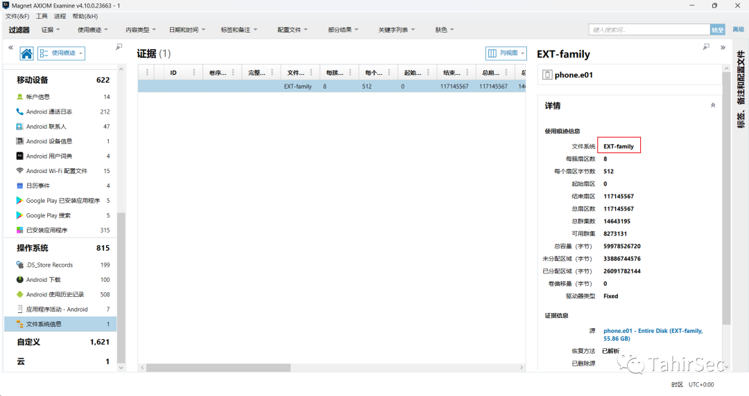 打开Magnet AXIOM分析phone.e01数据镜像,文件类型为ext。