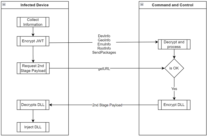 研究人员发现了一个使用 Xamarin 实现的 Android 后门,Xamarin 是一个开源框架,允许使用 .NET 和 C# 构建 Android 和 iOS 应用程序。尝试通过社会工程获得可访问权限,然后与命令和控制服务器进行通信,以评估是否下载在运行时作为程序集 DLL 动态注入的第二阶段有效负载,以充分利用控制设备并执行欺诈行为,例如点击广告、安装应用程序以及未经用户同意的其他出于经济动机的行为。