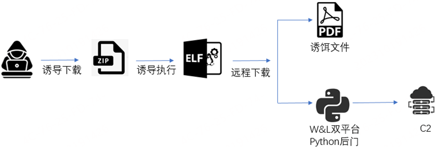 在Linux环境下,初始攻击样本为含有恶意ELF文件的ZIP压缩包文件,运行其中的ELF文件会下载关于印度国防部的诱饵文档,同时下载一个由Python打包的双平台攻击武器,该武器具备完整的远控功能。在Windows环境下,攻击者还是一如既往的含有恶意LNK的ZIP压缩文件,受害者点击其中LNK文件后会下载恶意代码从而开启一段复杂多阶段的攻击链,最终释放远控组件,从而完成窃密活动。