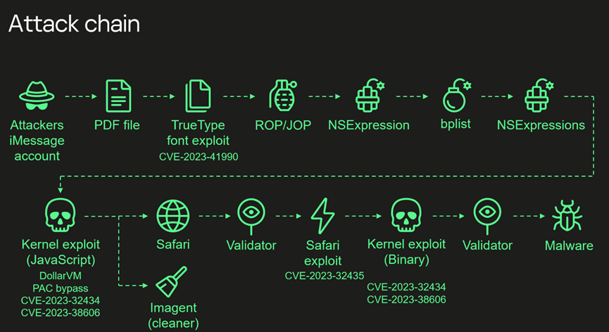 该攻击链的主要流程如下:发送恶意iMessage附件、利用远程代码执行漏洞(CVE-2023-41990)、JavaScript漏洞利用、使用DollarVM,支持新旧iPhone和PAC绕过、整数溢出漏洞利用(CVE-2023-32434)、硬件内存映射I/O(MMIO)绕过、JavaScript漏洞利用后续行动(如启动IMAgent进程、注入载荷)、Safari漏洞利用CVE-2023-32435执行Shellcode、 Shellcode执行漏洞(CVE-2023-32434和CVE-2023-38606)、漏洞利用获得Root权限,然后执行其他阶段,加载间谍软件。