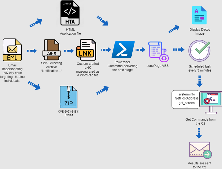 其中,VBS文件实际上为恶意软件LonePage,执行时,它会创建一个隐藏的PowerShell进程,进而实现与硬编码的通信以获取文本文件,并进行检索键盘记录程序、窃取信息、屏幕截图以及下载其它payload等恶意操作。此外,研究人员发现,11月,UAC-0099继续发送PDF钓鱼文档,通过使用HTA和ZIP文件,以及利用WinRAR漏洞(CVE-2023-38831)来传播LONEPAGE。其中,CVE-2023-38831漏洞于2023年4月被发现,当用户在未修补的WinRAR版本中打开攻击者特制的ZIP文件并双击良性文件时,将执行扩展名为"cmd"的文件。目前,WinRAR更新版本已于2023年8月2日发布。
