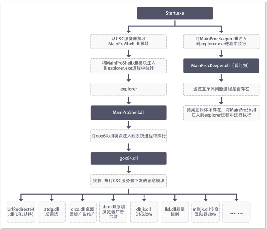 该病毒被运行后,会先从C&C服务器接收一个主加载器MainProShell.dll,然后将其注入到系统进程Explorer.exe中,以执行各种恶意操作。同时,该病毒还部署了一个看门狗模块(MainProcKeeper.dll),确保其持续在系统中活跃。