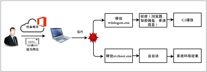 该木马运行后会释放winlogon.exe和svchost.exe两个恶意文件,其中winlogon.exe主要功能是窃密,svchost.exe则是设置木马自启动并收集环境信息。本文将对这两个恶意文件进行详细分析。