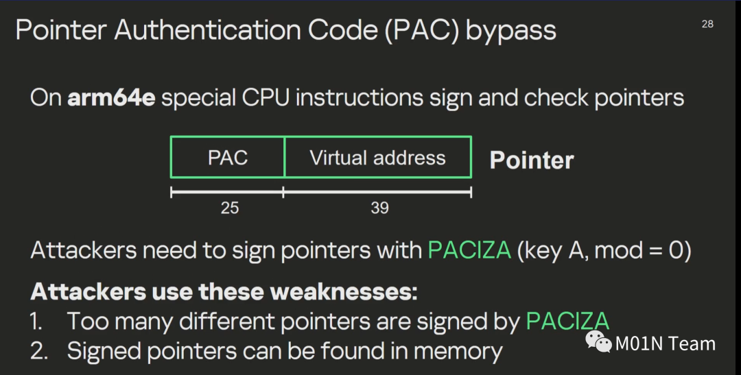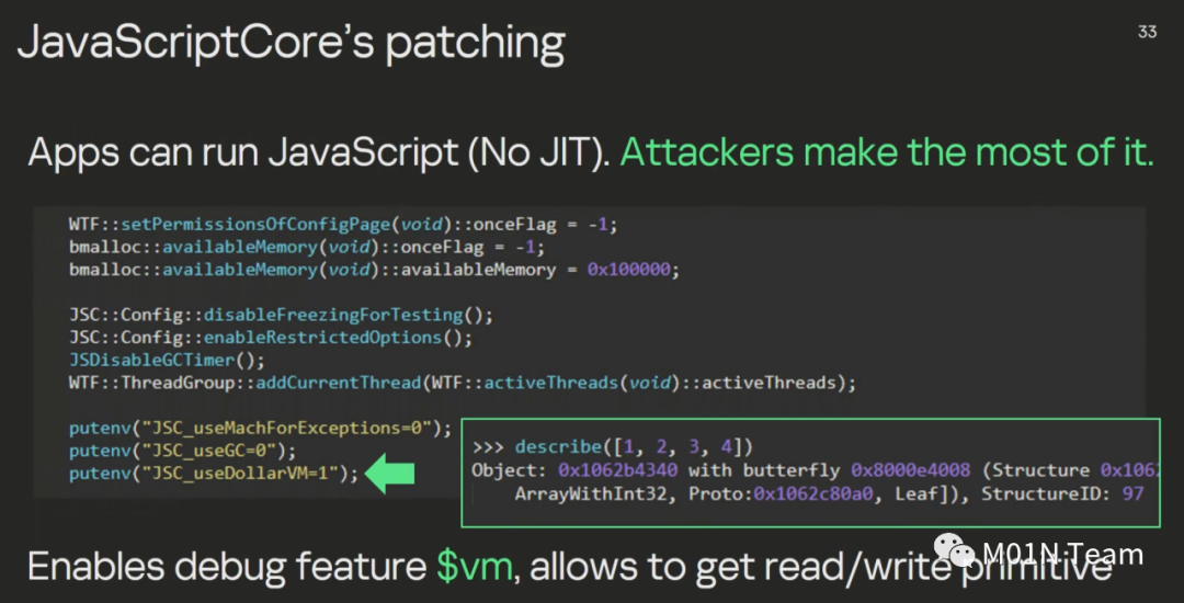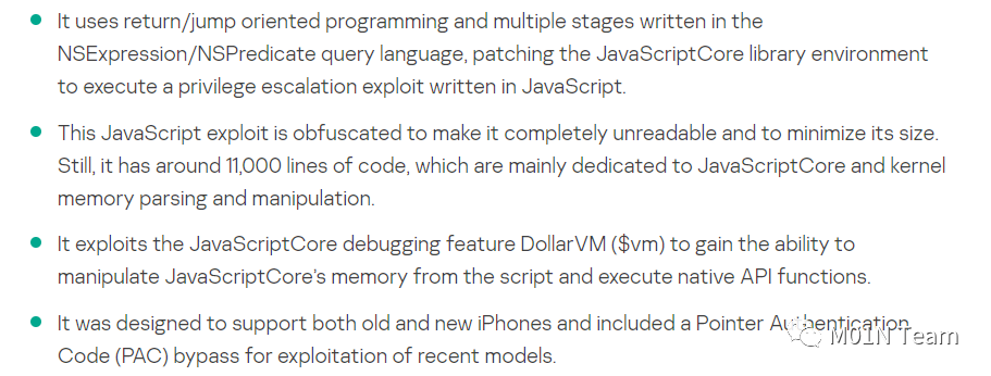 该js代码实现功能复杂, 首先用rop配合 NSExpression/NSPredicate 查询语言编写多阶段后,完善JavaScriptCore库后保障调试功能可用后,利用 DollarVM ($vm) 最终实现执行本机api函数的执行能力。并且由演讲ppt可知,攻击者通过内存中已存在的签名指针成功绕过了PAC指针签名保护机制,最终实现完整的函数执行能力。