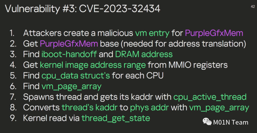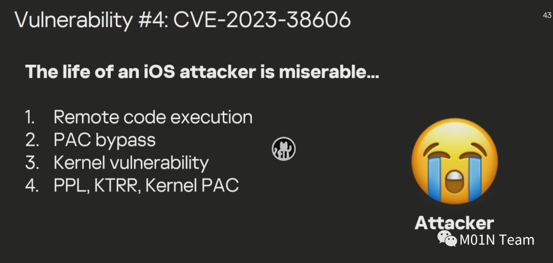 最终,攻击者利用CVE-2023-38606绕过基于硬件的内核内存保护,最终实现完整的代码执行。