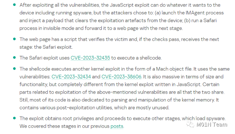 但是我们看到,攻击者居然用这个权限清除入侵痕迹,并且打开了Safari 并且在调用脚本验证受害者身份后调用CVE-2023-32435这个位于WebKit中的代码执行漏洞,然后又调用了一遍CVE-2023-32434 + CVE-2023-38606获取root权限执行间谍工具。