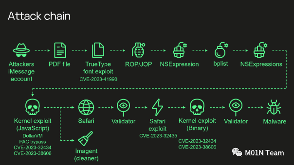 攻击的入口是通过一封带有恶意 iMessage 附件的电子邮件,攻击者通过投递一份包含 CVE-2023-41990 恶意载荷的 PDF 文件,成功利用了位于 fnt_ADJUST 中的 TrueType 字体指令数组越界漏洞。苹果公司对此漏洞的描述是“处理字体文件可能导致任意代码执行”。