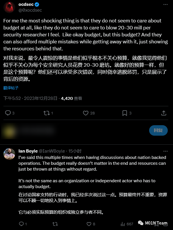 国外主流论坛上的网络安全从业者也认为“三角测量行动”所采取的利用多个昂贵漏洞的复杂利用链,唯有在面对高价值目标时不计资源投入的国家级威胁行为体才能负担,与需要考虑攻击成本的普通攻击组织有明显区别。