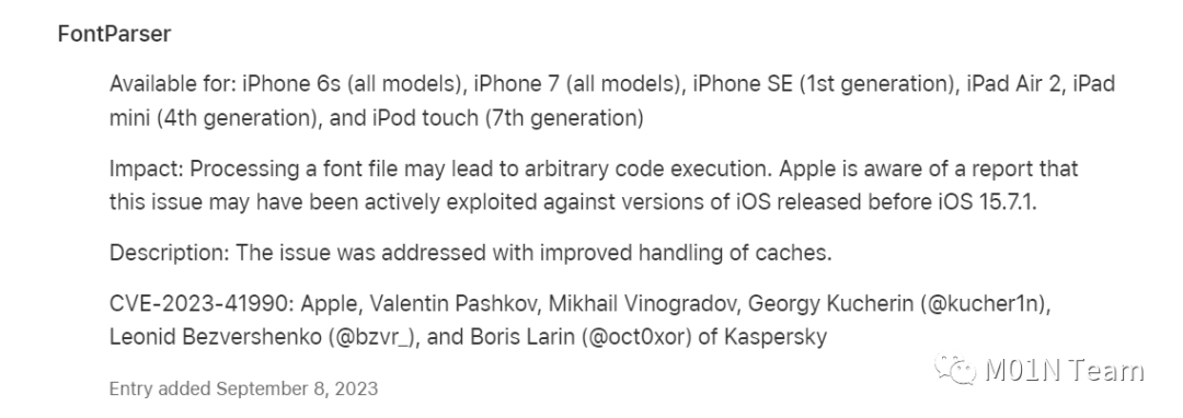 这一漏洞涉及的 fnt_ADJUST 模块早在九十年代就已存在,然而直到 2023 年 1 月,苹果才在 iOS 16.3 和 macOS 13.2 中悄悄地删除了这个模块的功能。在 2023 年 7 月,该漏洞的信息被披露,同时在 iOS 15 和 macOS 12 中通过改进缓存处理的方式对这一漏洞进行了修复。