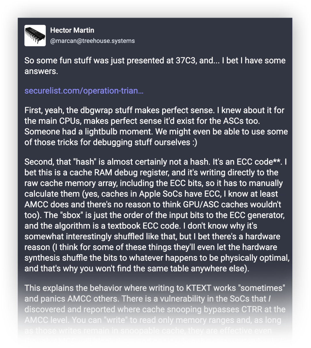 这个引发全网讨论的 bug,在我这种外行看来充满疑点,不过一位系统底层大佬 Hector Martin (marcan) 给出了一个相对合理的解释。marcan 主导了 Asahi Linux 项目——支持 Apple Silicon 芯片的 Linux 发行版,对硬件细节了如指掌。