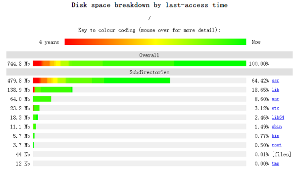 [root@localhost ~]# tar zxvf agedu-r9723.tar.gz[root@localhost ~]# cd agedu-r9723[root@localhost ~]# ./configure[root@localhost ~]# make && make install[root@localhost ~]# agedu -s / #-s扫描[root@localhost ~]# agedu -w --address 192.168.0.10:80 #-w输入一个网页链接[root@localhost ~]# agedu -w --address 192.168.0.108080 --auth none #--auth关闭认证如果不加端口号会生成一个随机的用浏览器访问
