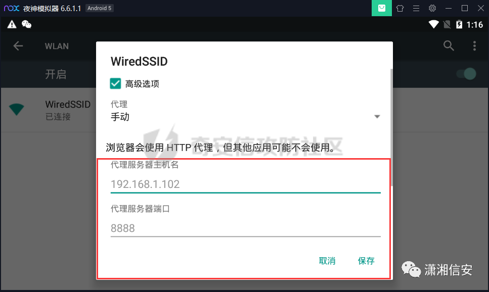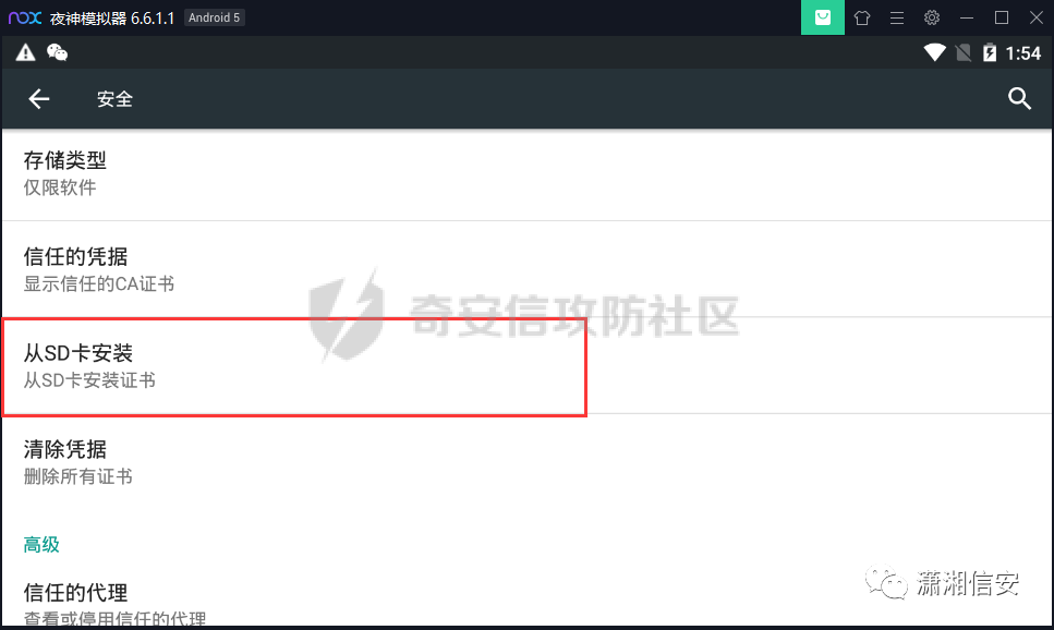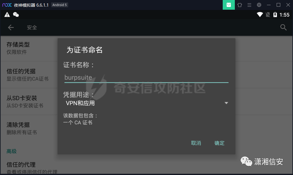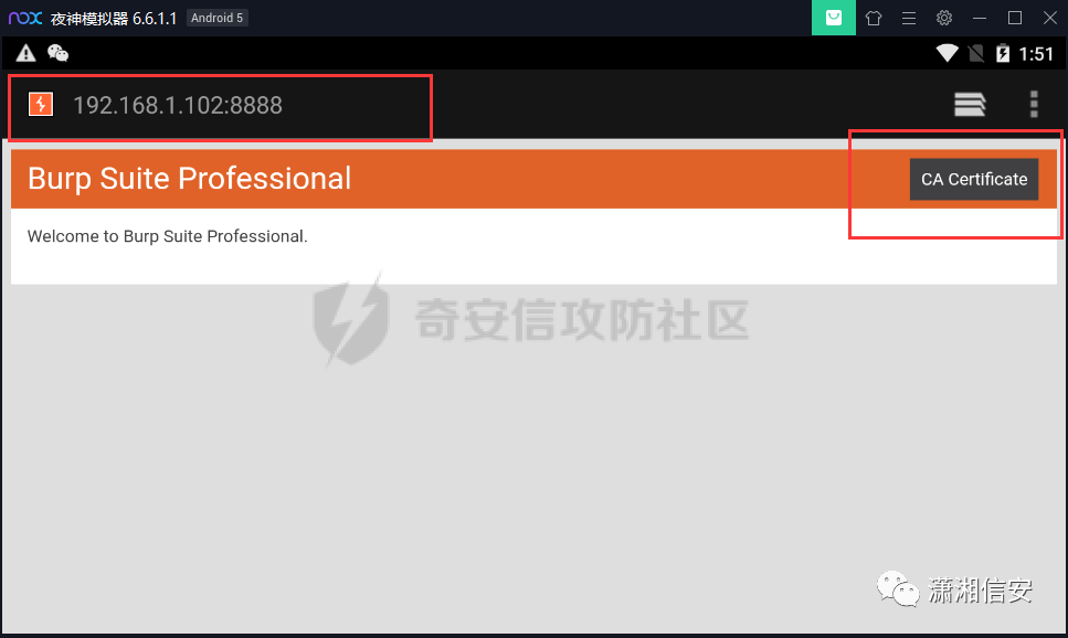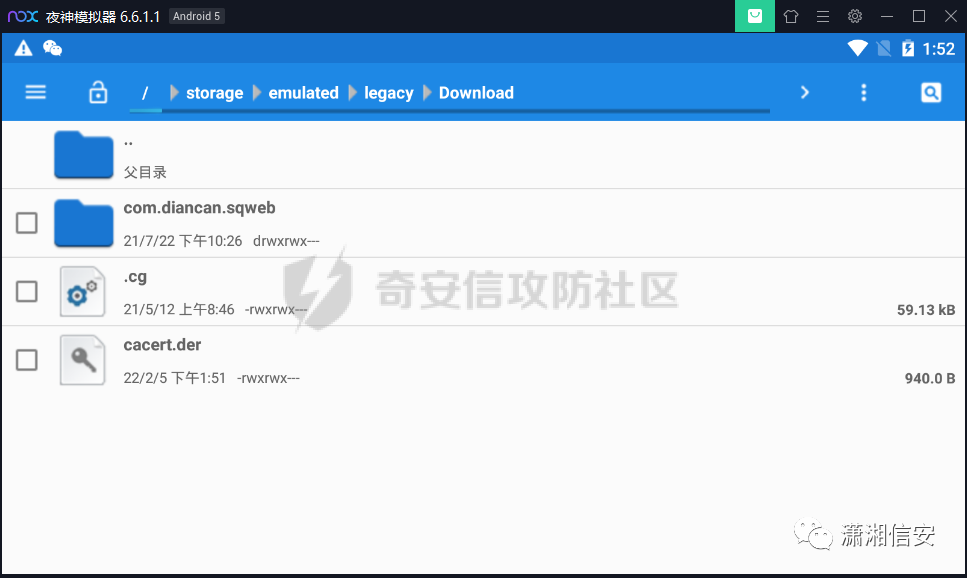 我使用的是夜神模拟器配合 burpsuite 进行抓包。夜神模拟器我使用的是6.6.1.1的版本,算是很老的版本了,内设系统为Android5.0。新的版本中安卓似乎都是7.0以上了,抓取 HTTPS 包会比较麻烦,所以我就一直没有换版本。如果有需要的朋友可以自取,后面会打包云盘在文章底部。首先我们需要设置好抓包环境,先通过ipconfig查看我们当前 ip,这里我用的是以太网,也就是插着网线;如果是连着 WIFI,则找对应的即可在 burpsuite 添加上,这里我设置端口为8888,可以按照自己需求更改打开夜神模拟器,在 WLAN 选择手动代理,并设置代理地址和代理端口,和 burpsuite 对应保存后,打开浏览器访问ip:port,这里的话为192.168.1.102:8888,点击CA Certificate下载证书打开文件管理器,在sdcard->Download目录中可以看到下载下来的证书将cacert.der更名为cacert.cer,也就是将后缀改成cer,然后到手机设置->安全中,选择从 SD 卡安装测试一下,浏览器访问百度,burpsuite 能正常抓包说明已经设置环境成功我们在模拟器里登录微信,然后随便选择一个微信小程序打开