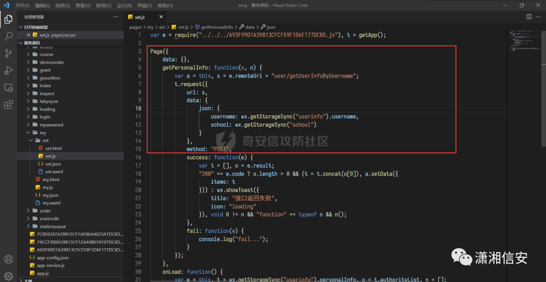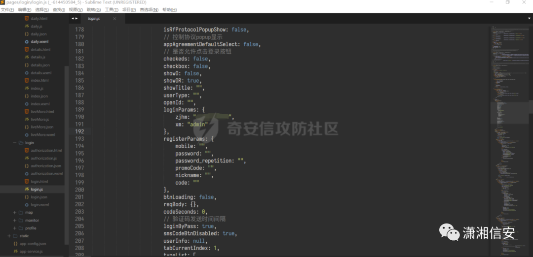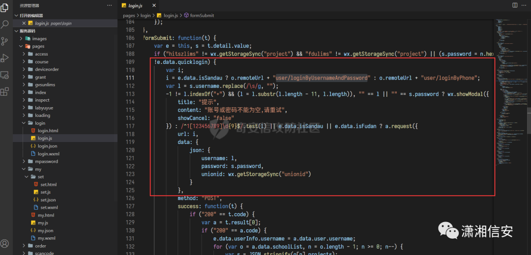 直接将文件鼠标拖拽到 GUI 界面即可开始反编译,在拖入文件的当前目录得到反编译生成的文件夹举例某小程序审计,在登录界面爆破无关之后,直接反编译拖源码审计一下,反编译出来的源码,我们着重看 js 文件及其配置文件即可。第一想法就是先找一些接口,尝试是否有未授权之类的漏洞,下面就是找到的一处路由user/getUserInfoByUsername