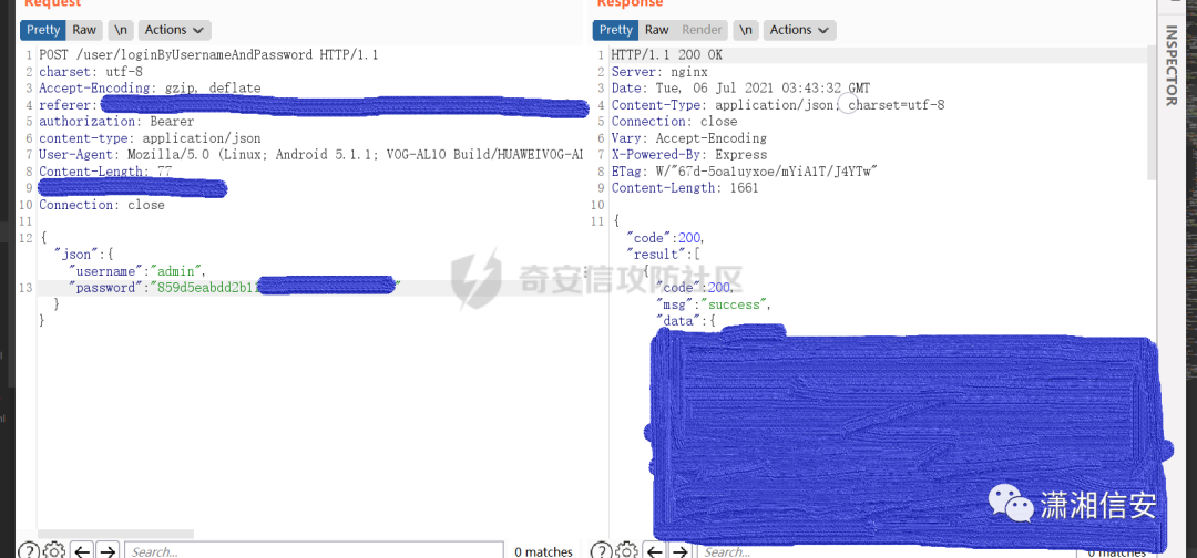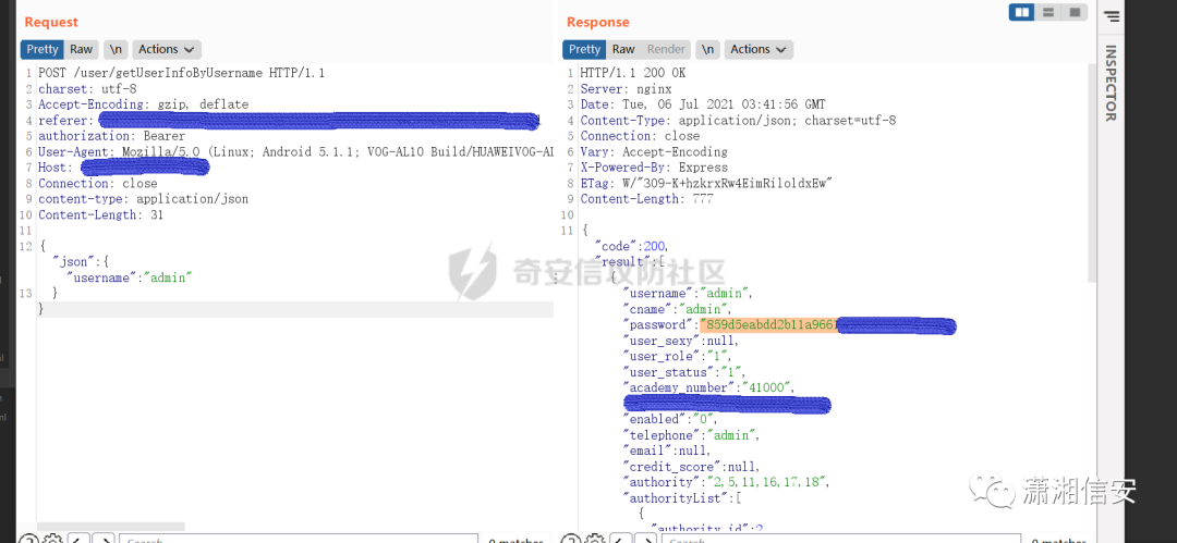 可以看到发送数据类型为 json 格式,并且参数为username和school,于是尝试构造请求发送成功获取系统管理员详细信息,其中包括关键的密码。获取到 md5 加密形式的密码密文后,本来还想去 cmd5 去解一下, 但是接下来注意到一个登录路由user/loginByUsernameAndPassword从源码中都看得出来就是通过账号密码去登录,刚刚未授权得到的密码存储为 md5 加密形式,想来登录应该也是进行 md5 加密的形式,所以直接发送加密形式的密码即可,构造请求发送验证登录成功。这类常常出现未授权漏洞的路由命名方式大抵都是xxxByXXXIdxxxByUsernamexxxbyphone......