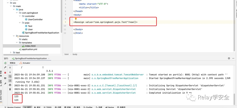<#assign value="com.springboot.pojo.Test"?new()>我们来看到是否会输123,可以发现成功调用了构造方法。