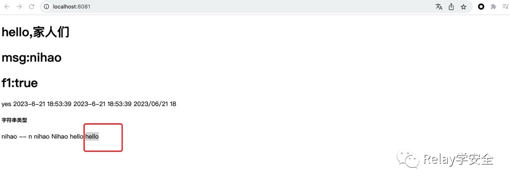 <!DOCTYPE html><html lang="en"><head><meta charset="UTF-8"><title></title></head><body><h1>hello,家人们</h1><h1>msg:${msg}</h1><!--表达式,此时变成字符创类型--><h1>f1:${flag?string}</h1><!--?string 和 ?c是一样的--><!--相当于三元运算符,针对类型转换-->${flag?string("yes","no")}<!--${flag?string("yes","no")}转换flag为string类型 判断如果是true 那么输出yes 如果是false 那么输出no--><!--日期类型在freemarker中日期类型不能直接输出 需要转换成日期型字符串1.年月日 ? date2.时分秒 ? time3 年月日时分秒 ?datetime4 自定义格式 ?string("自定义")-->${createData?date}${createData?time}${createData?datetime}${createData?string("yyyy/MM/dd HH")}<br><!--字符串类型--><h5>字符串类型</h5>${msg} --<!--截取字符串-->${msg?substring(0,1)}<!--首字母小写输出-->${msg?uncap_first}<!--首字母大写输出-->${msg?cap_first}</body></html>