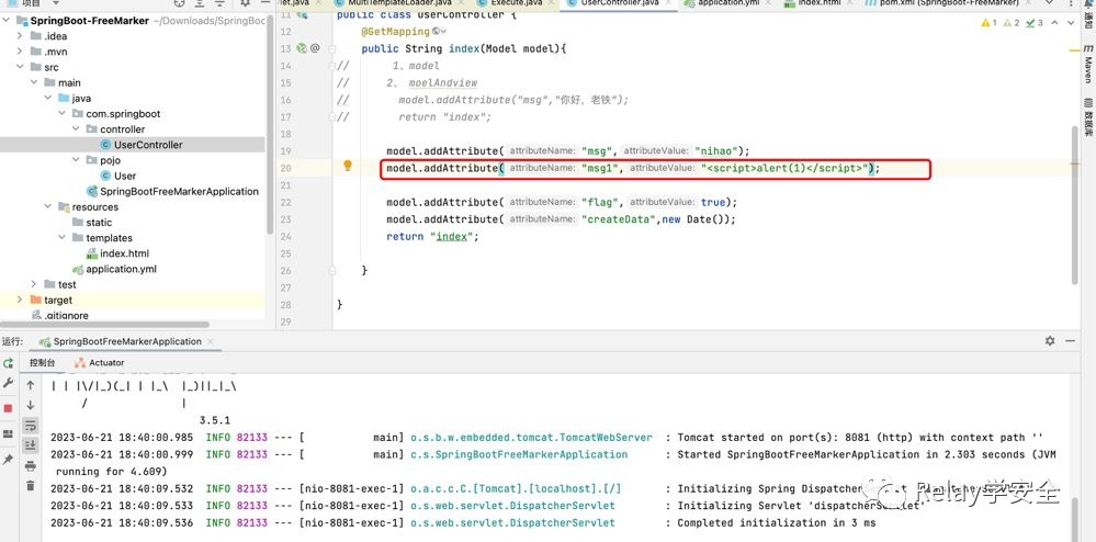 @GetMappingpublic String index(Model model){model.addAttribute("msg","你好,老铁");model.addAttribute("msg","nihao");model.addAttribute("flag",true);model.addAttribute("createData",new Date());return "index";}