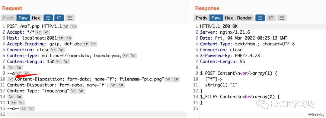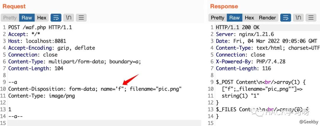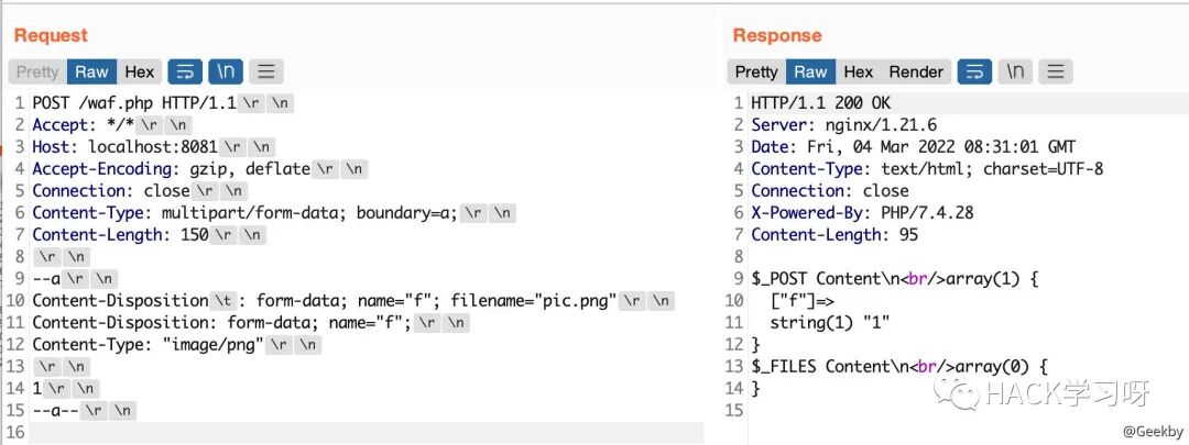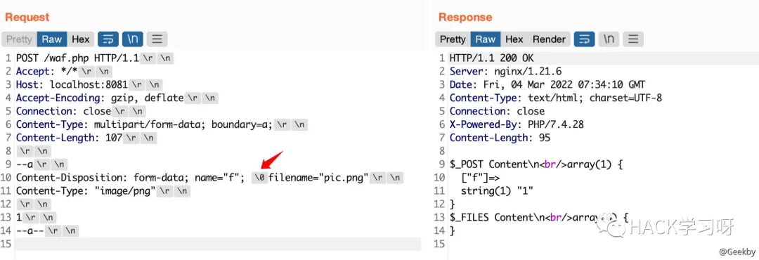 multipart/form-data 格式也是可以传递 POST 参数的。对于 Nginx + PHP 的架构,Nginx 实际上是不负责解析 multipart/form-data 的 body 部分的,而是交由 PHP 来解析,因此 WAF 所获取的内容就很有可能与后端的 PHP 发生不一致。