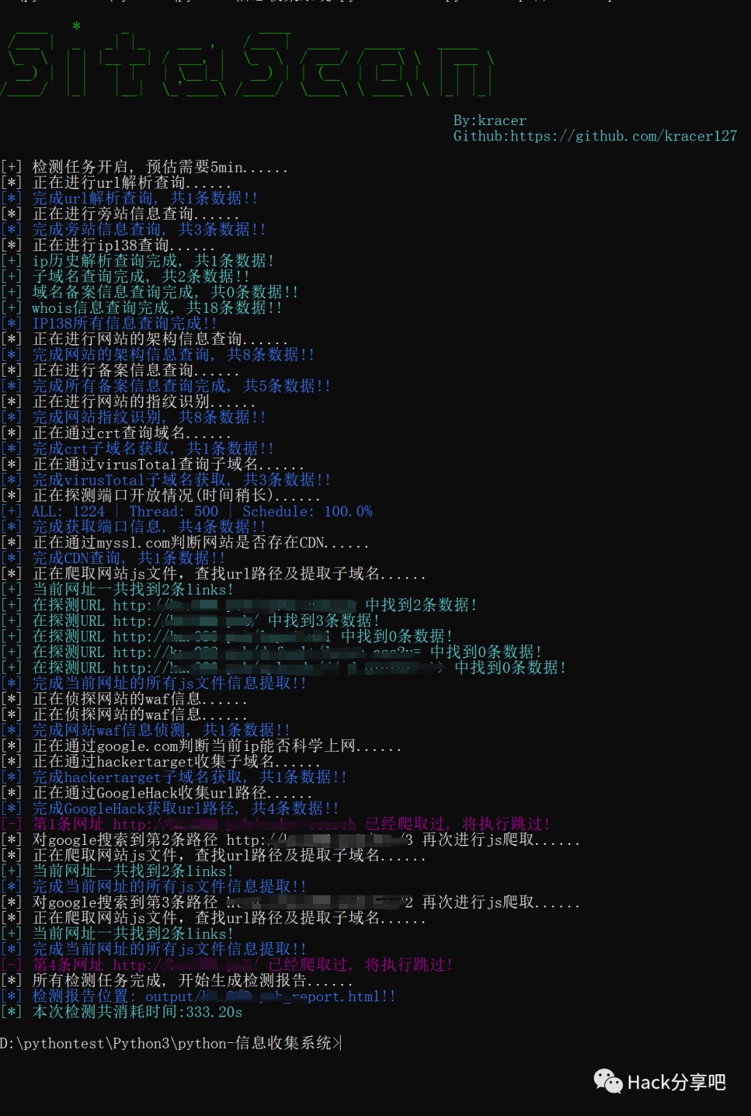 文件夹:lib文件夹 --- 配置文件。文件夹: output文件夹 --- 探测结果生成的html报告表。文件夹:Third --- 第三方模块, 包含wafwoof识别云waf、JSFinder爬取js文件。文件:commom.py --- 用户输入处理、网址存活检测及处理最终结果并生成html报告。文件:config.py --- requests库的请求设置:header头部、超时时间、google的url提取量、网络错误尝试次数、重定向和代理设置,以及定义扫描的端口。文件:main.py --- 主函数入口。文件:request.py --- 封装的所有请求类。