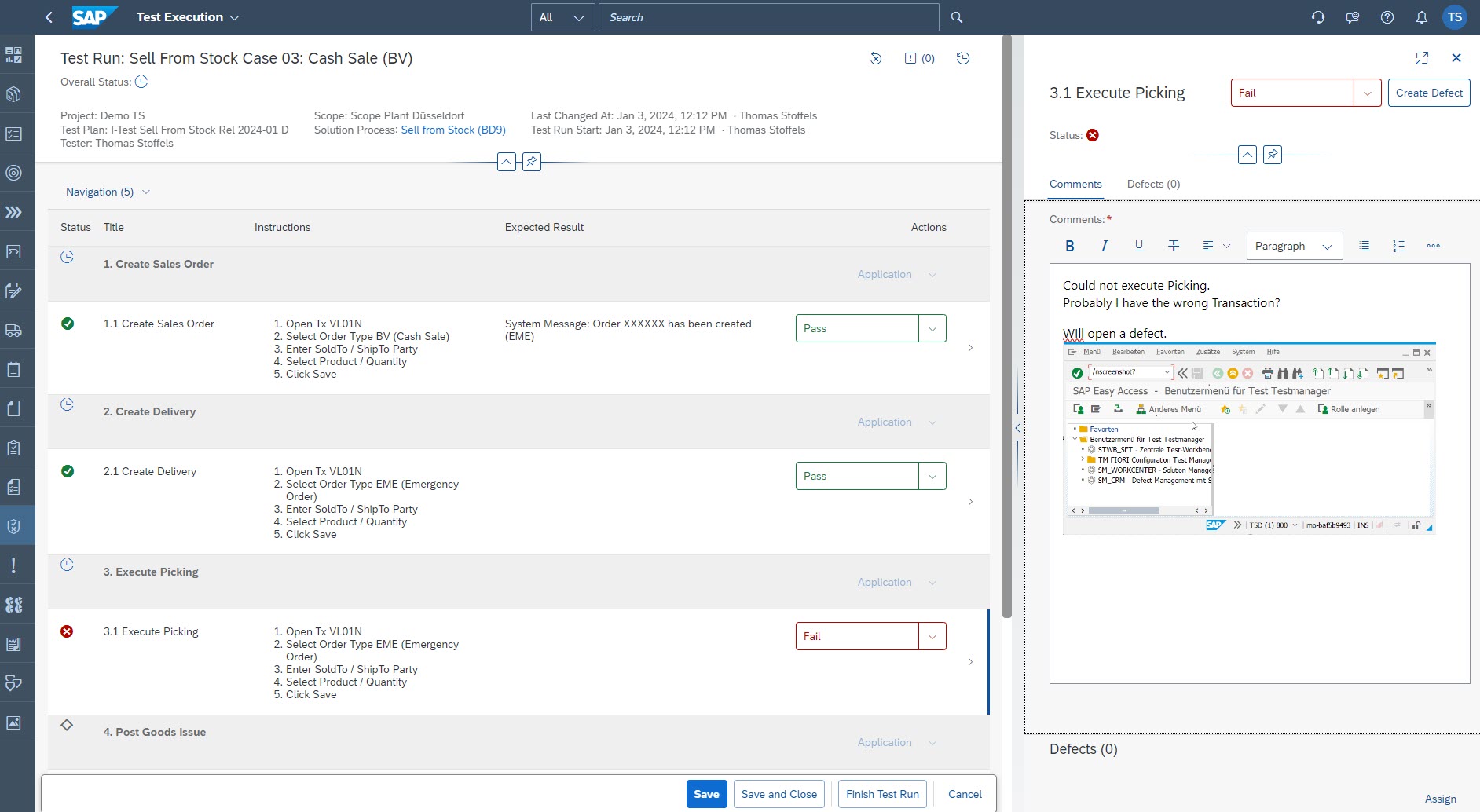 Having started or resumed the test run we can essentially set the status for each step of the test case. Detailed documentation per step can be provided as a comment the right hand side panel as rich test (mandatory if a step is set to failed). It is now also possible to paste screenshots directly from the clipboard. Defects can be opened using the button in the top right corner.
