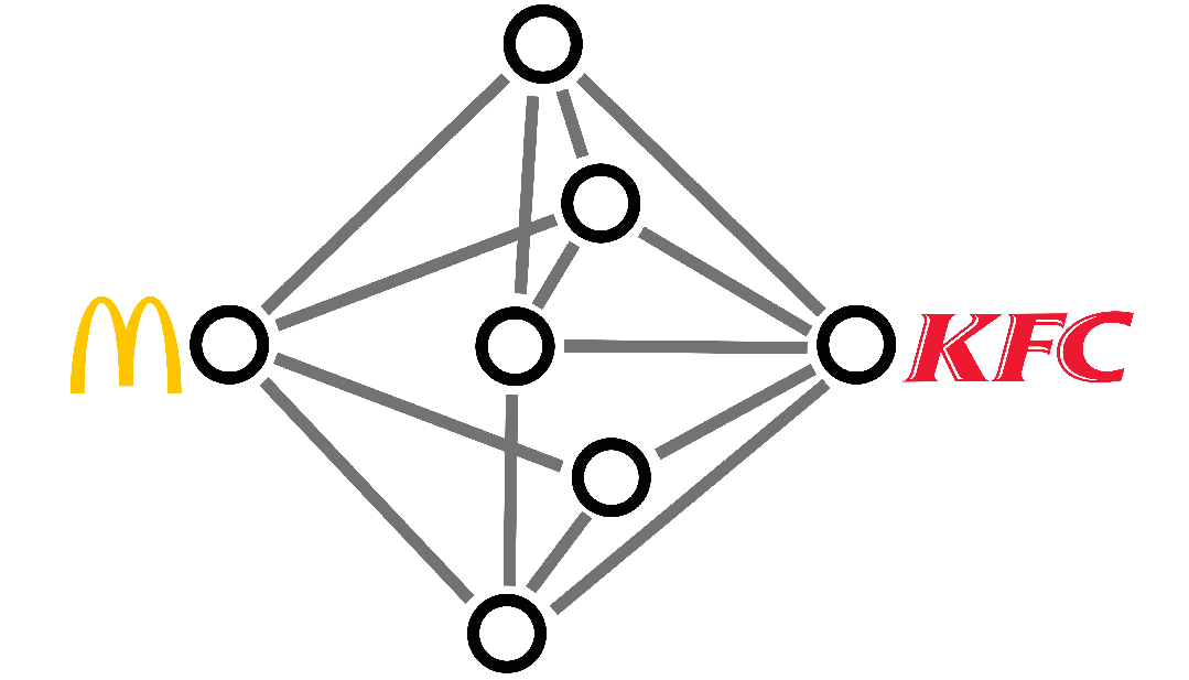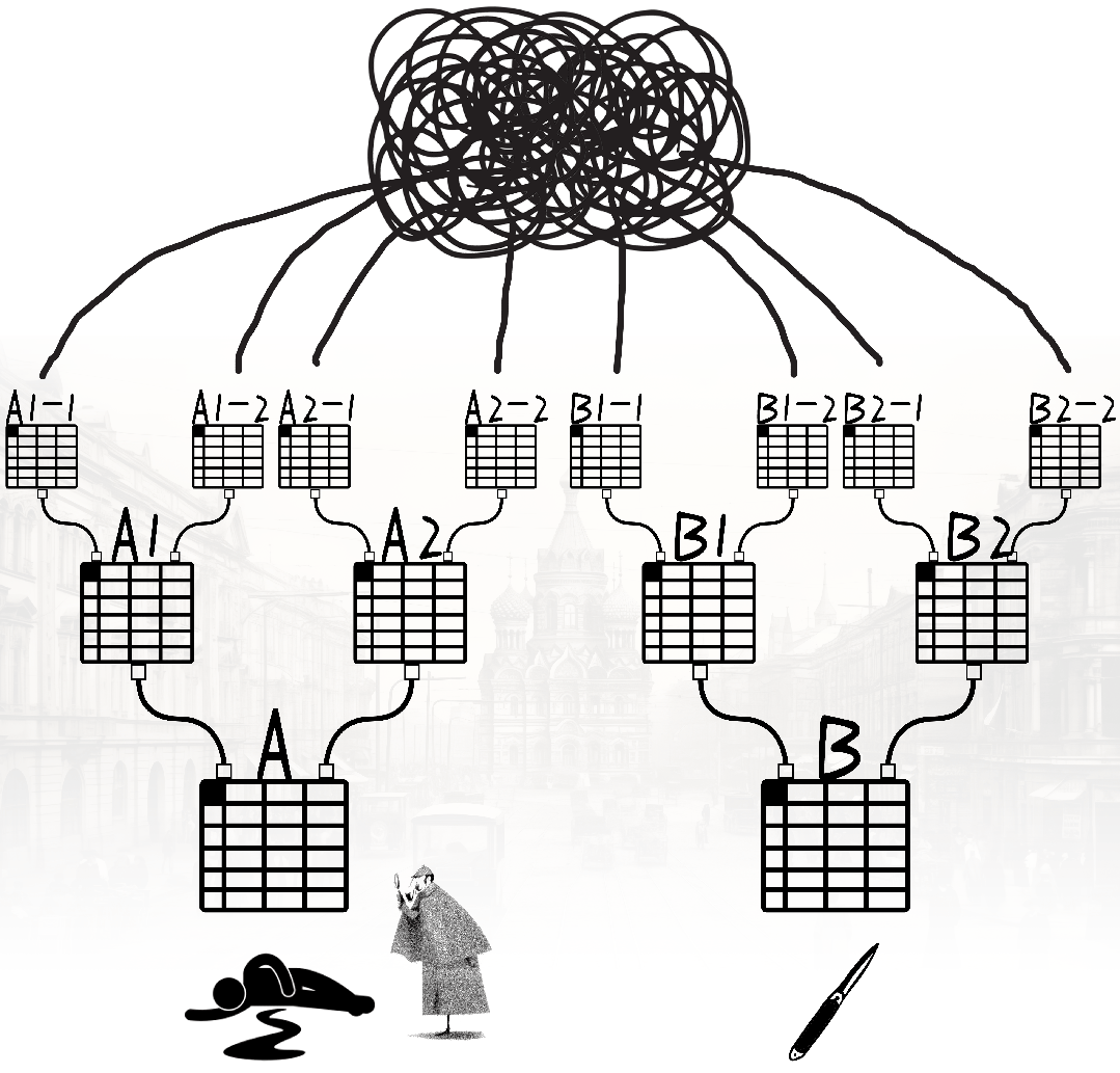 他把“表格A”上的100人和“表格B”上的100人分别连线,成为10000组配对,然后挨个走访调查。他想发现这些“配对”之间有没有“曾同处一室”或“认识同一位中间人”的情况,但组合众多,其中的可能性也多如牛毛。史·伊万懦夫·中咬咬牙,以坚毅的决心开始推进!调查进行了几个月,案件陷入一团乱麻,但警探遇到了不得的事儿:表格B上有一位刀具经销商格列布,格列布对他说,你这么有毅力有恒心,不妨跟我做生意,比当警探好赚多了!表格A上有另一位富豪安托尼,他的女儿居然对自己产生了爱慕之情。于是,史·伊万懦夫·中毅然决定出任格列布公司的总经理,然后娶了安托尼的女儿,走上人生巅峰。我们回到警探身边,不难发现,他面前发散出了无数个表格:表格A1上的第一个地点又有好多人去过,他们组成了“表格A1-1”,表格A1上的第二个地点又有好多人去过,他们组成了“表格A1-2”,