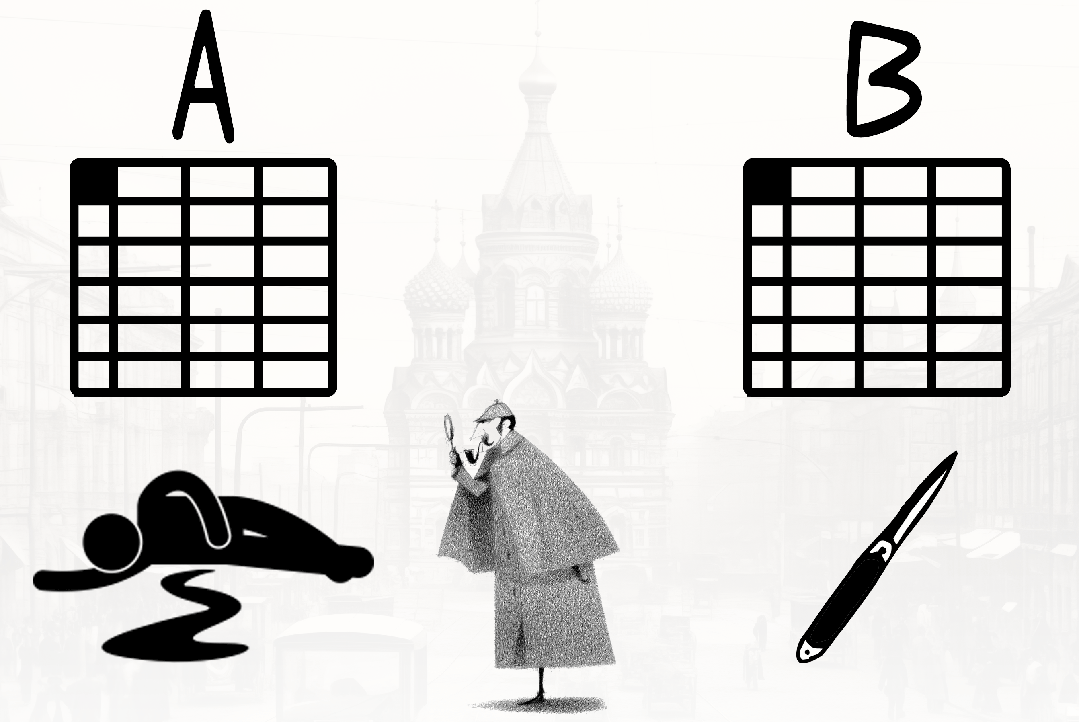 19世纪,圣彼得堡的一座高档公寓里,发生了一起凶案。一位富商在浴室被刺死,而凶器就遗落在一旁,是一把精致的开信刀。资深的警探史·伊万懦夫·中奉命调查此事。他制定了天衣无缝的调查计划:1)先调查富商,把和他可能有过节的100人列成一张“表格A”;2)再调查刀具工匠,这款刀是限量款,只做过100把,于是把买过刀的客户也列成一张“表格B”;3)然后对A、B两个表格进行比对,看看有没有重合的人。