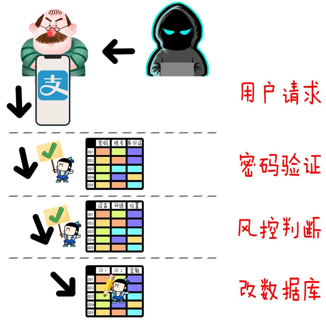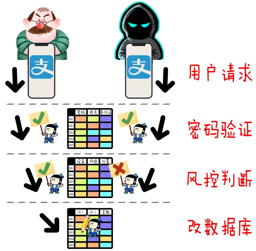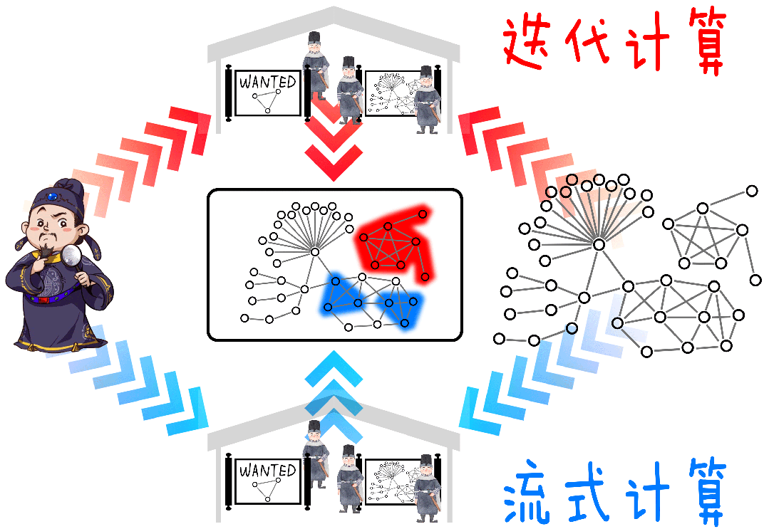 “大数据”当然不是什么新朋友,但我们知道的大数据引擎都是和普通数据库配套的。图数据库比普通数据库多定义出了一层“关系”属性,原有的大数据系统不能直接算这种关系。这就需要老师傅出手,做一个能和图数据库组CP的“图大数据引擎”。说到图大数据引擎在蚂蚁内部的诞生故事,还是和坏人有关系。2018年双11开始,支付宝基于图数据库的风控系统上线,每次转账都会查一下“AB关系”。大批的骗子马上发现:骗钱难度进入了“地狱模式”,如果总用一个账号收钱,行为异常太明显,分分钟会被系统标记为高危,然后封堵。于是他们开始“进化”,养了一堆账号,不仅每个账号活动的频率降低,金额也被打散了,单独账号的异常特征就弱化了。这个号“不小心”被封了,没关系,用另一个顶上,反正号有的是。如此,犯罪团伙就变成了软粘的八爪鱼,断了这个爪,还有别的爪↓↓↓诶,既然是影分身,就和真正的人不一样。毕竟从关系上讲,控制这堆账户的人还是一个团伙,这些账户总会在某些方面表现出一致的性质。支付宝老师傅要做的就是:找出这些隐秘的规律!这时,我们就得隆重请上一个新角色:“安全数据分析师”。举个栗子,警察蜀黍抓了一个诈骗团伙,然后缴获了他们手上的所有支付宝账号,然后这些账号会给到支付宝的数据分析师,他们就像“神探狄仁杰”,仔细研究:这堆号之间,有怎样的关系模式?然后把这些洞察写成一组识别规则。至于这些规则具体是啥,我就不举例了,因为这玩意儿说出来你能看到,坏人也能看到。。。总之,一组规则就像一个“海捕文书”,“衙役”们需要照着这个公文把所有的账户都筛查一遍。这个衙役,就是“大数据引擎”了。注意,“海捕”一次的工作量可比只查一次AB两点之间的关系要大多了,因为要把所有用户、设备拢共上万亿个点和边都拉网式筛查一遍嘛!20毫秒,那可是断然干不完了,大概需要几个小时的时间才能通盘算一遍。而这样的计算一般每天凌晨执行一次。每天一次其实够了。犯罪团伙嘛,比较稳定,不太可能今天你们几个还是团伙,明天就从良了——每天地毯式围剿一遍,足以压制。左边是分析师的规则,右边是图数据库。两个汇总在图大数据引擎里,算出下面的答案。