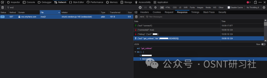 单击“响应”选项卡并选择{"act","get_onlines","ids":[***]}如下以蓝色突出显示的响应。JSON 结果位于ids: [...]部分下。