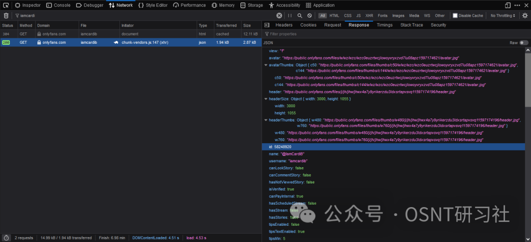 接下来,打开“检查器”菜单并单击“网络”选项卡。按 F5 刷新页面,现在在搜索栏中搜索目标用户名,您将看到 JSON 格式的用户个人资料信息。请务必保存原始 JSON 数据并打开所有avatar.jpg和header.jpg图像 URL,并将它们全部保存到驱动器中以供以后参考。