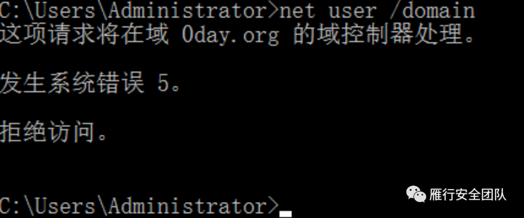 本机是直接net user,如果在域环境里则是net user /domain(当前必须以域用户身份登陆凭据,否则会拒绝访问,如下图)