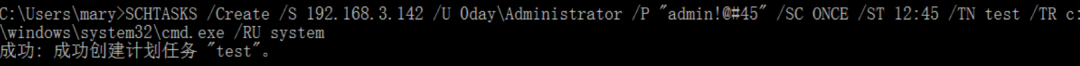 SCHTASKS /Create /S 192.168.3.142 /U 0day\Administrator /P "admin!@#45" /SC ONCE/ST 12:45 /TN test /TR c:\windows\system32\cmd.exe /RU system (一定要写后面的 /RUsystem)