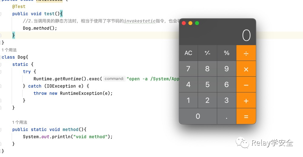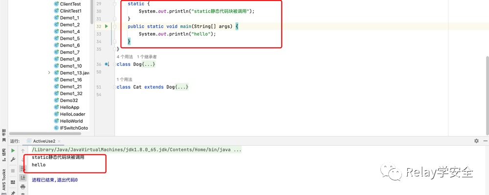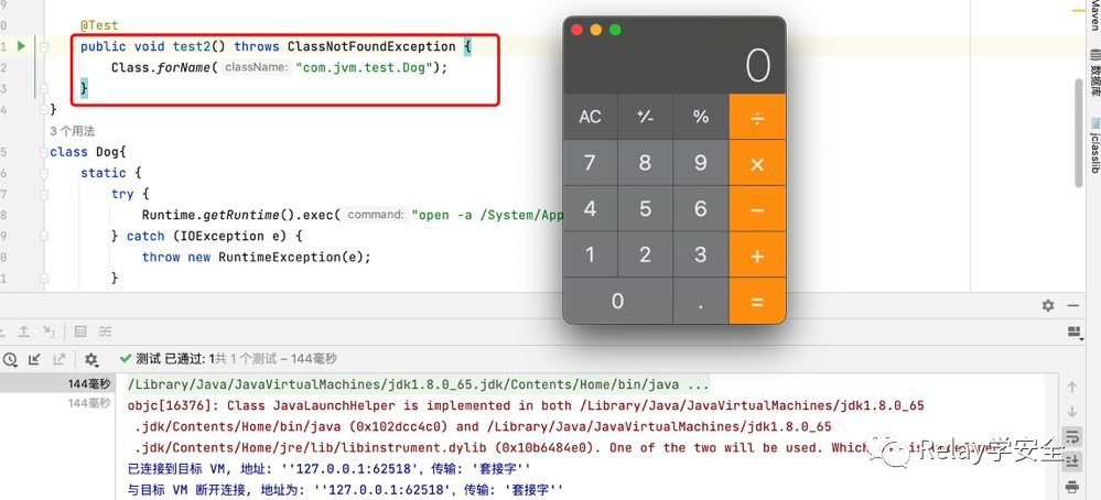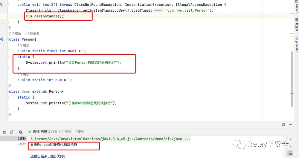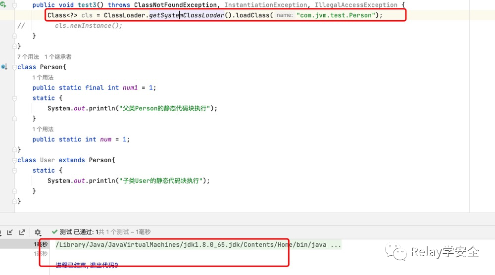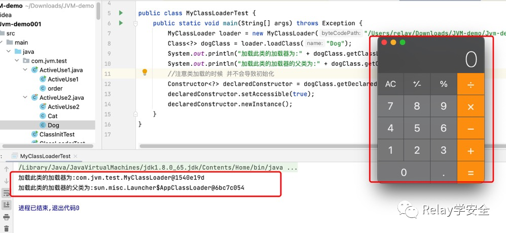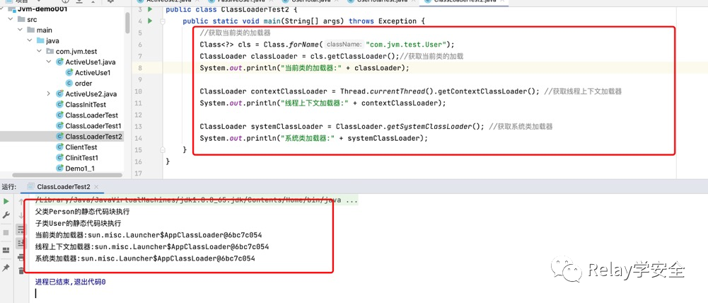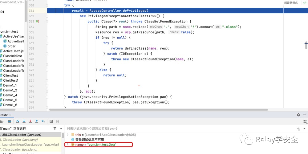 package com.jvm.test;import java.lang.reflect.Constructor;public class MyClassLoaderTest {public static void main(String[] args) throws Exception {MyClassLoader loader = new MyClassLoader("/Users/relay/Downloads/JVM-demo/Jvm-demo001/target/classes/com/jvm/test/");Class<?> dogClass = loader.loadClass("Dog");System.out.println("加载此类的加载器为:" + dogClass.getClassLoader());System.out.println("加载此类的加载器的父类为:" + dogClass.getClassLoader().getParent());//注意类加载的时候 并不会导致初始化Constructor<?> declaredConstructor = dogClass.getDeclaredConstructor();//初始化之后才会declaredConstructor.setAccessible(true);declaredConstructor.newInstance();}}