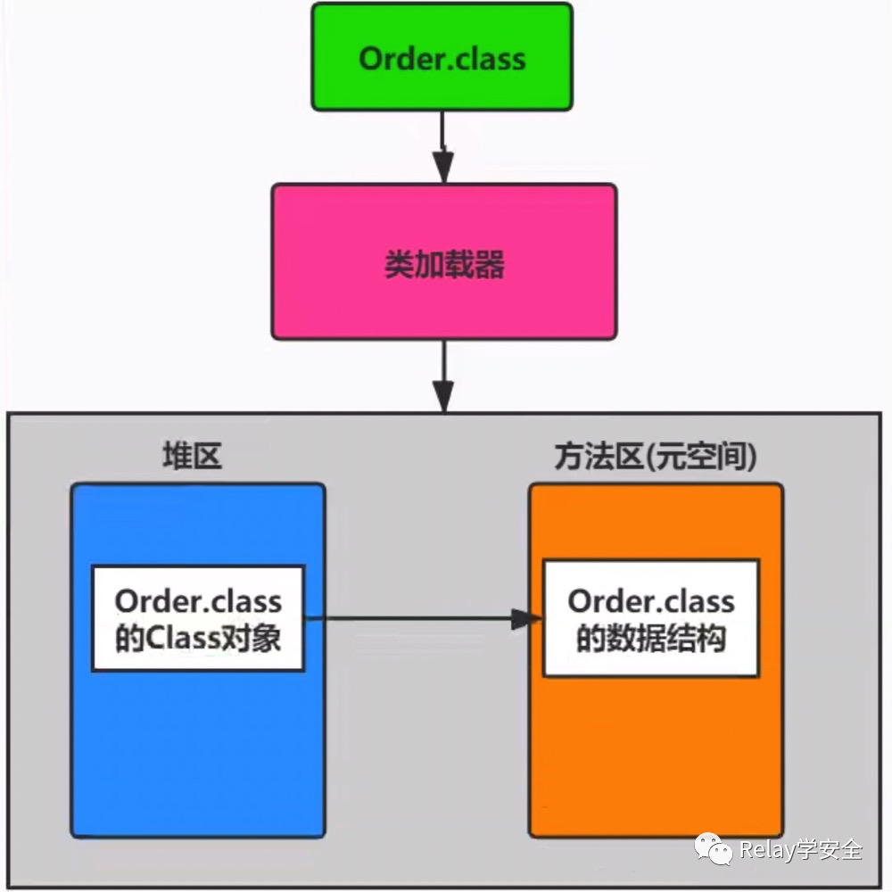 首先order.class通过类加载器进行加载,加载之后会存储在元空间中,加载到元空间之后,会在堆中创建一个大的Class实例。用来封装元空间内的数据结构。