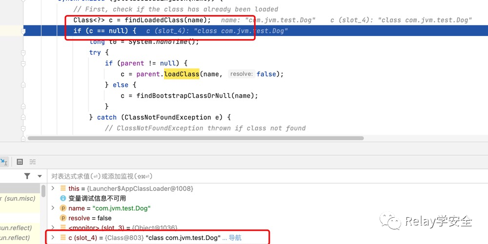 首先调用synchronized表示同步操作,也就是说一个类只允许加载一次。紧接着调用findLoadedClass方法在缓存中进行判断是否已经加载过同名的类。可以看到我这里已经加载过了,为什么?因为我在loadClass之前写了一个Class.forName("com.jvm.test.Dog"); 这段代码。表示类已经加载过了。我们去掉这行代码之后然后进入if判断。