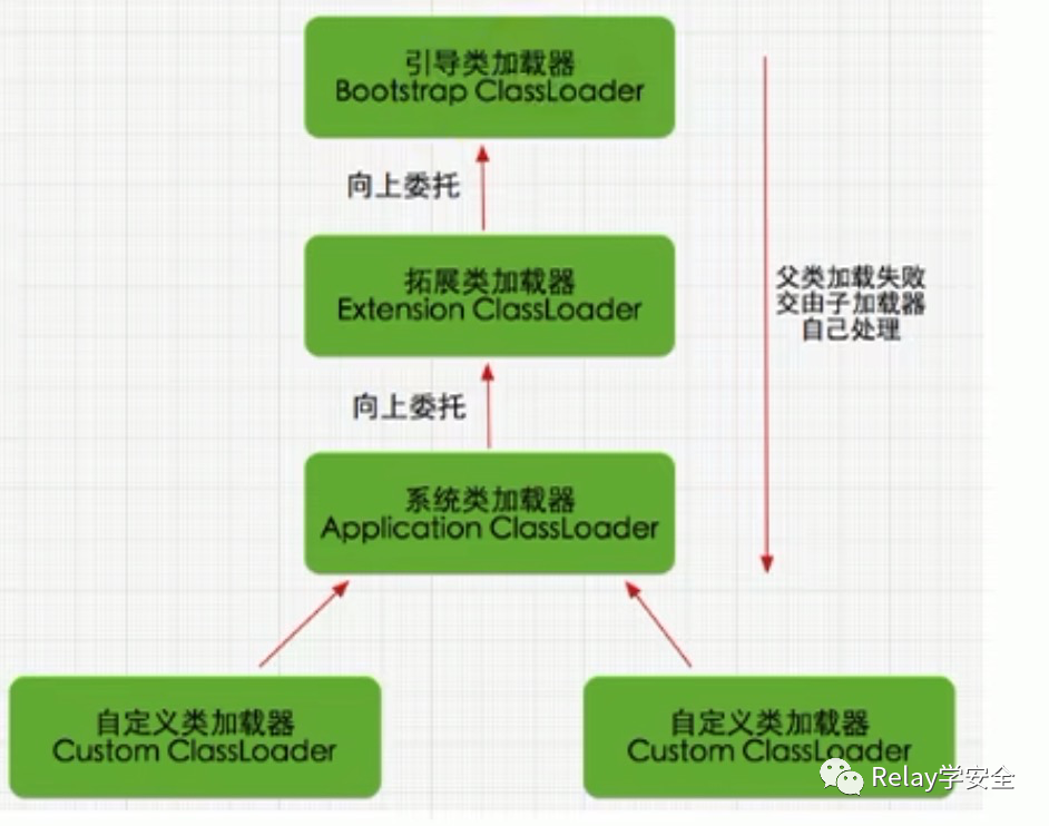如果父类加载器还存在父类加载器,那么继续向上委托,依次递归,请求最终到达顶层的启动类加载器。