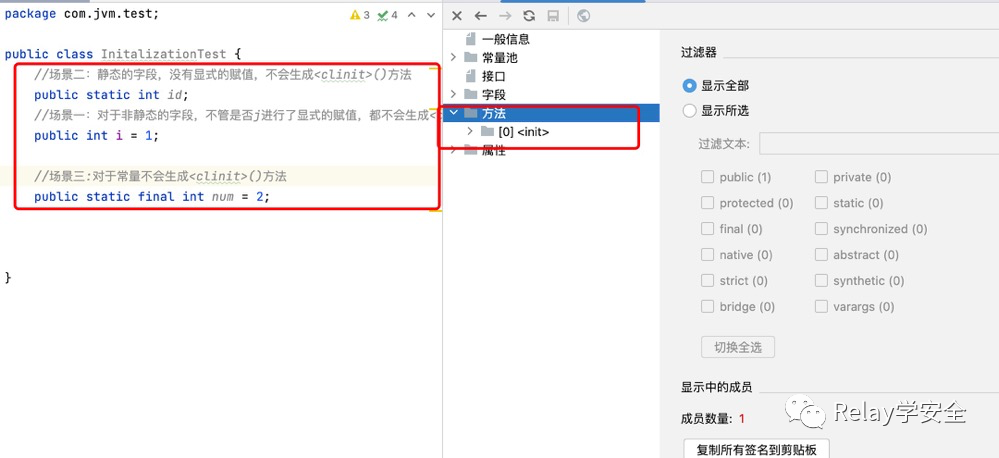 <clinit>这个方法里面执行的就是上面的静态变量以及静态代码块中的代码。