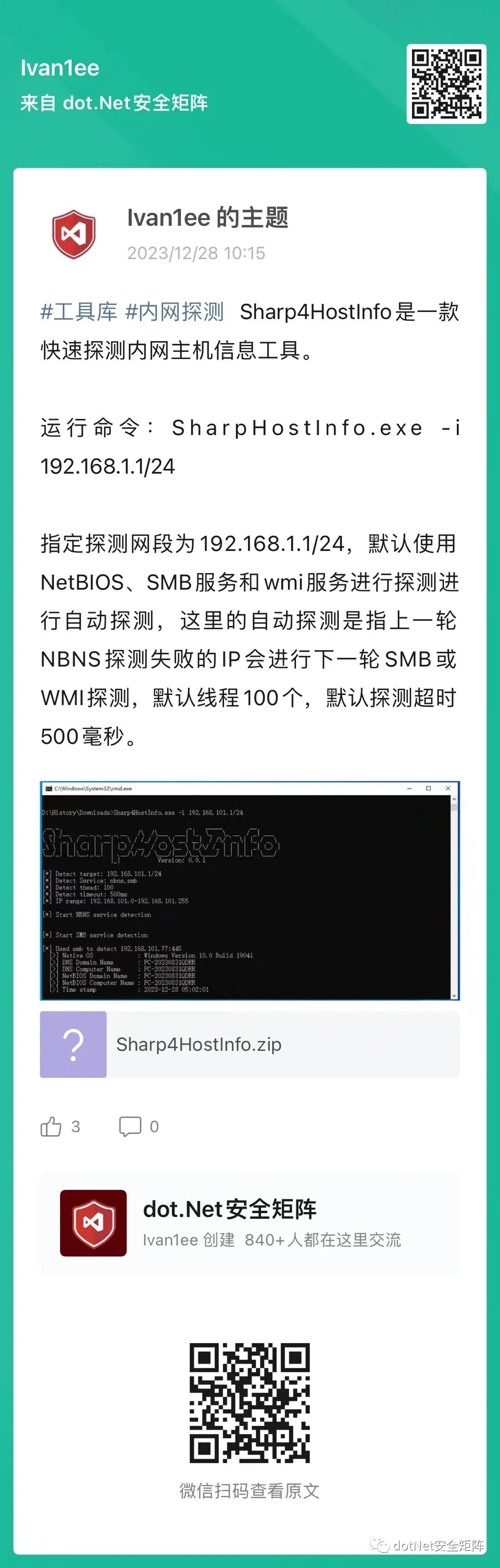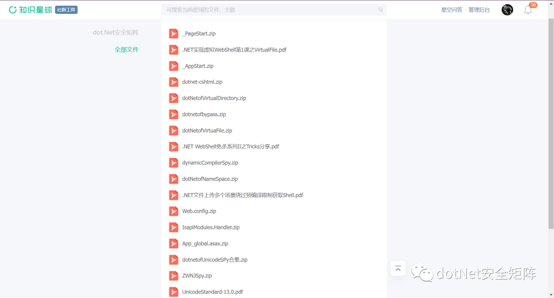 星球汇聚了各行业安全攻防技术大咖,并且每日分享.NET安全技术干货以及交流解答各类技术等问题,社区中发布很多高质量的.NET安全资源,可以说市面上很少见,都是干货。其中主题包括.NET Tricks、漏洞分析、内存马、代码审计、预编译、反序列化、webshell免杀、命令执行、C#工具库等等,后续还会倾力打造专刊、视频等配套学习资源,循序渐进的方式引导加深安全攻防技术提高以及岗位内推等等服务。