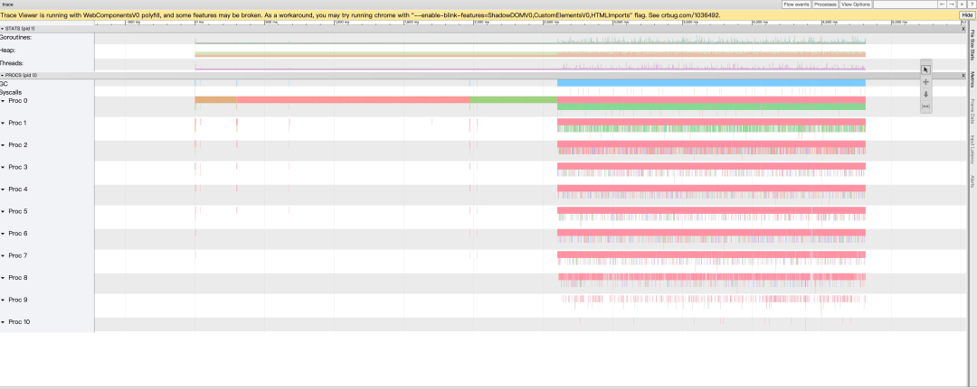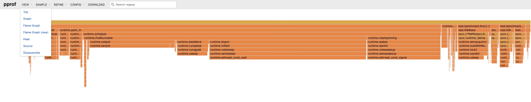 View trace // 按照时间查看thread、goroutine分析、heap等相关信息Goroutine analysis // goroutine相关分析Syscall blocking profile // syscall 相关Scheduler latency profile // 调度相关........