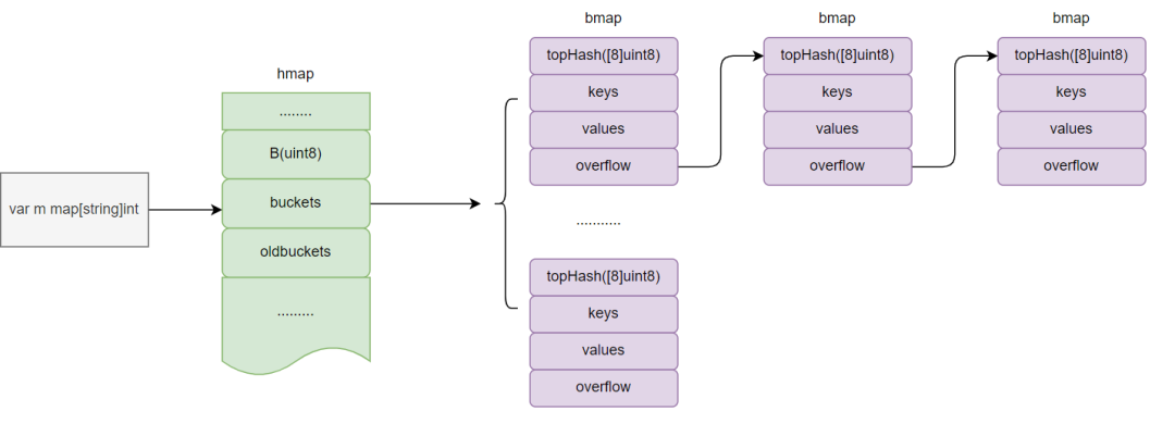 type hmap struct {......B uint8 // buckets中桶的数目为2的B次方个hash0 uint32 // hash seedbuckets unsafe.Pointer // bucket实现oldbuckets unsafe.Pointer // 旧bucket,主要用于rehash的渐渐式迁移......}