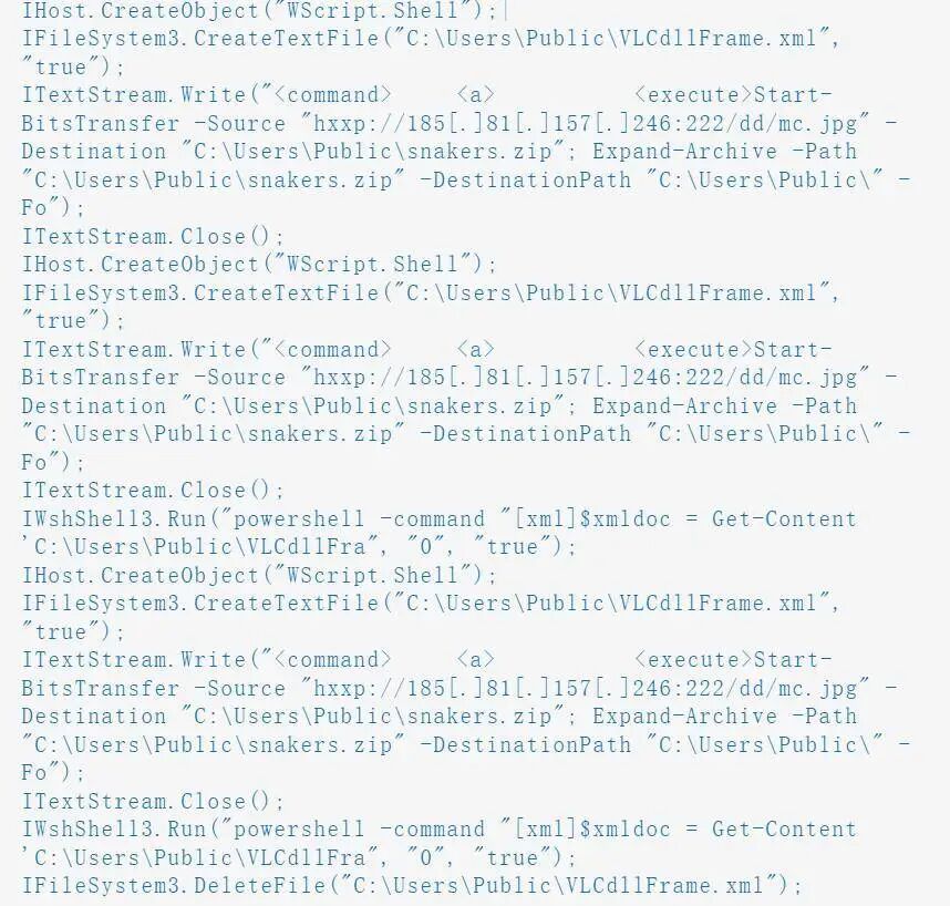 脚本使用start - bittransfer命令从hxxp://185[.]81[.]157[.]246:222/dd/mc.jpg下载文件,以“snakers.zip”保存。随后,它将内容提取到C:\Users\Public目录中,或者在某些情况下提取到C:\Users\Public\ pictures \中。执行PowerShell命令后,脚本将删除之前创建的VLCdllFrame.xml文件。
