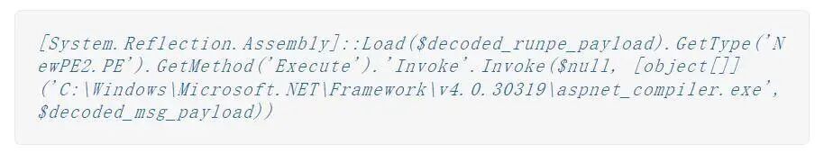这是一个PowerShell脚本,动态加载.NET程序集,特别是NewPE2.PE类型,并调用其Execute方法。Execute方法用于向进程中注入与aspnet_compiler.exe相关的代码,它是为恶意代码注入而设计的,允许恶意攻击者在合法的aspnet_compiler.exe进程的上下文中执行额外的代码。
